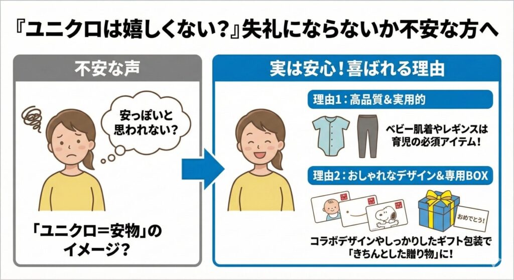 検索していると「ユニクロ 出産祝い いらない」「失礼」といった言葉を見かけて不安になる方もいるかもしれません。ですが、安心してください。今のパパママ世代で、ユニクロをもらって「失礼だ」と感じる人はほとんどいません。