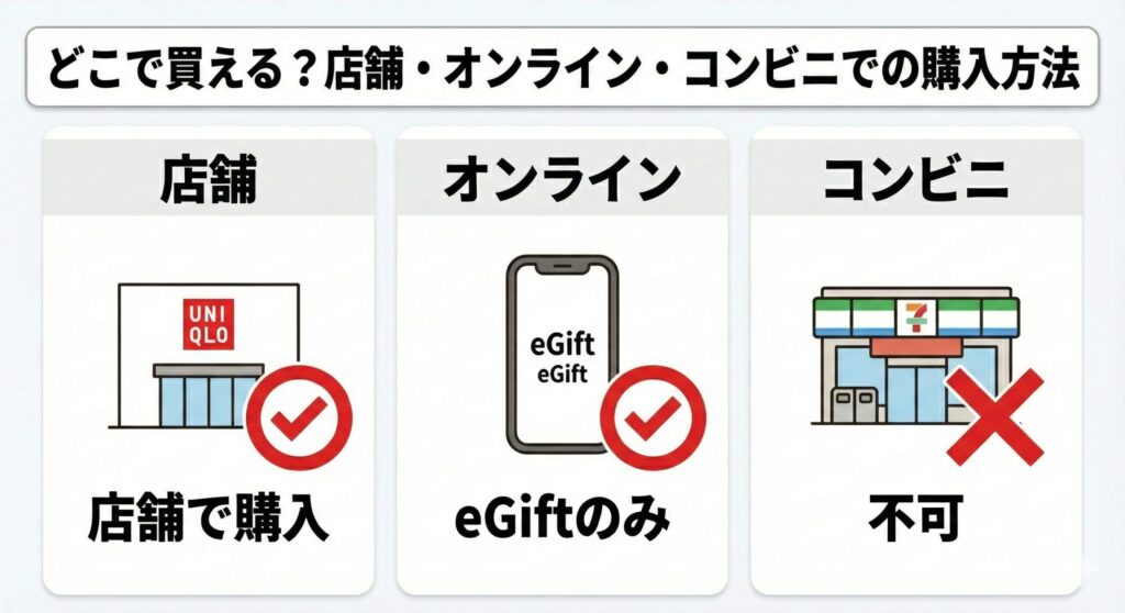 Amazonギフト券のように「コンビニで売っている」と思われがちですが、ユニクロギフトカードはコンビニでは販売していません。(※ごく稀に一部地域でキャンペーンがある場合を除き、基本は売っていません)