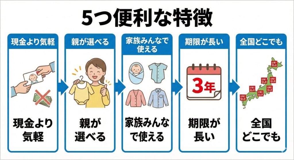 そんなユニクロですが、私が実際に出産祝いとしてユニクロギフトカードを贈り、また自分自身も親として「これは嬉しい!」と感じる理由は主に5つあります。